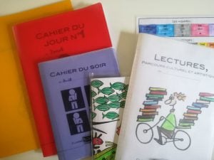 Órarendet tőle sem hallunk (mert nincs), tantárgyak és tankönyvek sincsenek (bár, ő az idén megvetetett az iskolával egy geometria munkafüzetet, nézzük el neki, lustaságból ad ilyet a gyerekek kezébe..), és itt tűnik föl nekem, hogy tanári asztal sincs! Tényleg nincs katedra, visszagondolok, hogy Bendiéknél sem volt. Ellenben van egy kényelmes fotelszerű antik karosszék, a “könyvtár” részen (az osztálynak az a sarka, ahol az olvasnivaló könyvek vannak). Sárga, meg zöld meg piros füzete Elizának is van, és nem kapnak fénymásolatot (“a hivatalos verzióm az, hogy mentsük meg az erdőket, de valójában ragaszkodom hozzá, hogy kézzel írjanak”) ezen felül egy vékonyka kisregény még a “tananyag”, már a másodikat olvassák a “félelem” témában. Ez az első “projekt” témája: körüljárják a “mitől félek/ mitől nem félek” dolgot. (Jobbat nem is találhatott volna ki az idén, Elizának épp jól jön.)