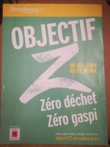 Az Eurométropole című ingyenes városi magazinból fényképeztem ki, ez a száma éppen teljes egészében a hulladékcsökkentésről szólt: “Az állampolárok mozgósítása a hulladékcsökkentés érdekében” volt a főcíme. A cél pedig a zéró hulladék, ez a szlogenje: “zéró hulladék, zéró pocsékolás – egy kihívás a jövőnkért”.