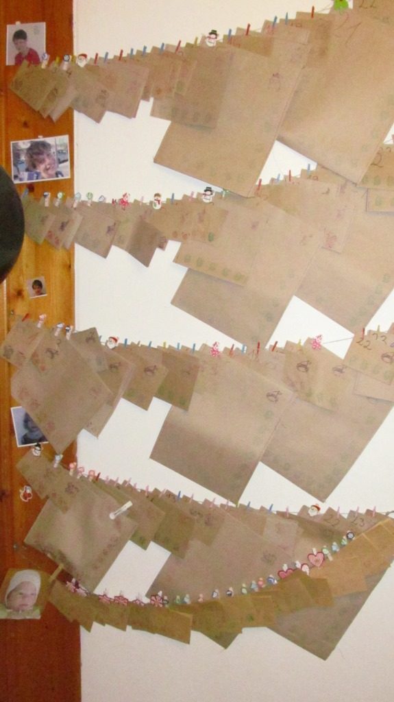 Mire megjönnek a kicsik, én föl is csipeszelem arra a zsinórra a 4×24 legóval töltött papírtasakot, most már várhatjuk a karácsonyt…