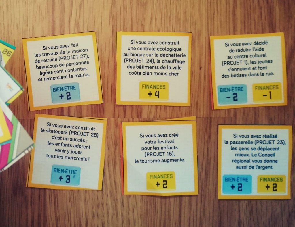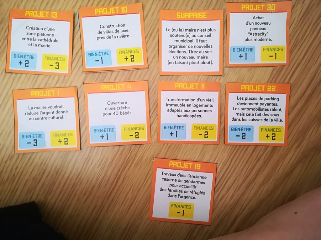 És a “Projektek” -kupacból kezdünk egymás után egy-egy kártyát húzni. És minden projektet megszavazunk: ha egyforma számú ellene és mellette szavazat van, akkor a projektet visszakeverjük a kupacba, egy későbbi ülésen újra napirendre kerül. Egyéb esetben – ha megszavaztuk – megvalósítjuk, ha leszavaztuk, elvetjük.