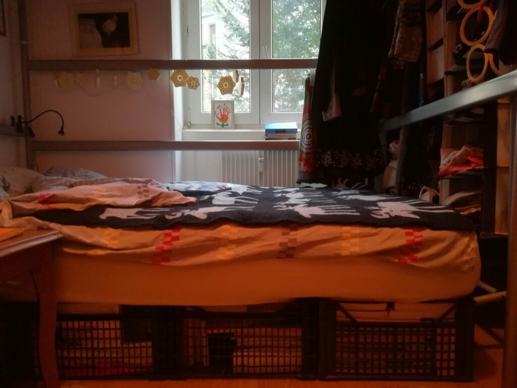 Lényeg, hogy valamikor októberben kaptunk egy galériaágyat (kétszemélyes, felnőtt, komolyan, ilyen is van, én nem is tudtam azelőtt), ingyen adták, már ez gyanús lehetett volna, az is volt, dehát mi nem vagyunk válogatósak, gondoltuk, jó lesz az! Eleinte jókat nevetégéltünk, amikor este fölmásztunk a létrán: ha-ha, hogy megfiatalodtunk (pedig dehogy! csak az illúzió volt meg), vajon mi jön majd az ötvenes éveinkben, ha a negyvenesek ilyen “visszatérés a kamaszkorba”? (Ezt majd meglátjuk, reméljük.) És szépen berendeztünk alatta egy kis olvasósarkot, asztalnak meg széknek jók voltak azok a könyvekkel teli banános-kartonok, amelykből már nem volt hova kirakni a könyveket, mert polc sem volt elegendő, meg a ruháim állványa is jól elfért pont alatta (mivel szekrényem sincs, ilyen fedetlenül lógnak a ruháim egy olyan gurulós állványon, tudjátok…).
