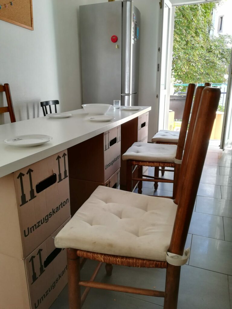 Hát, így vagyunk kérem máig, nem tesz semmit,és még ennél jobbat is tudunk, most kiderült: Úgy adódott, hogy a minap (az íróasztalból átalakított) étkezőasztalunknak csak a lábait vette meg valaki, a lapja nem kellett neki (igen, ilyen is van, kérem…). Nem mintha nem lenne még két másik asztal a lakásban (egy igazi étkező, amit egy barátnőmtől vettem még Budapesten, amikor ők költöztek, meg egy másik is, amit már itt kaptunk, a nappaliba került íróasztalnak), de nálunk az a megoldás született, hogy ilyen Umzugskartonokat teszünk a lap alá. Hmmm… Ha gyerekkorotokban veletek is előfordult, hogy nagyobb vendéség esetén titeket ültettek a lábhoz, akkor gondolom fel tudjátok idézni az érzést… Csak ez hatványozottabban olyan érzés. Mivel sokkal szélesebbre kell szétteni a lábat… Ellenben teljesen demokratikus: mindannyiunknak, nem csak egyeseknek!