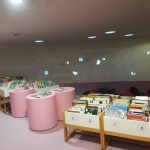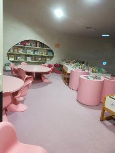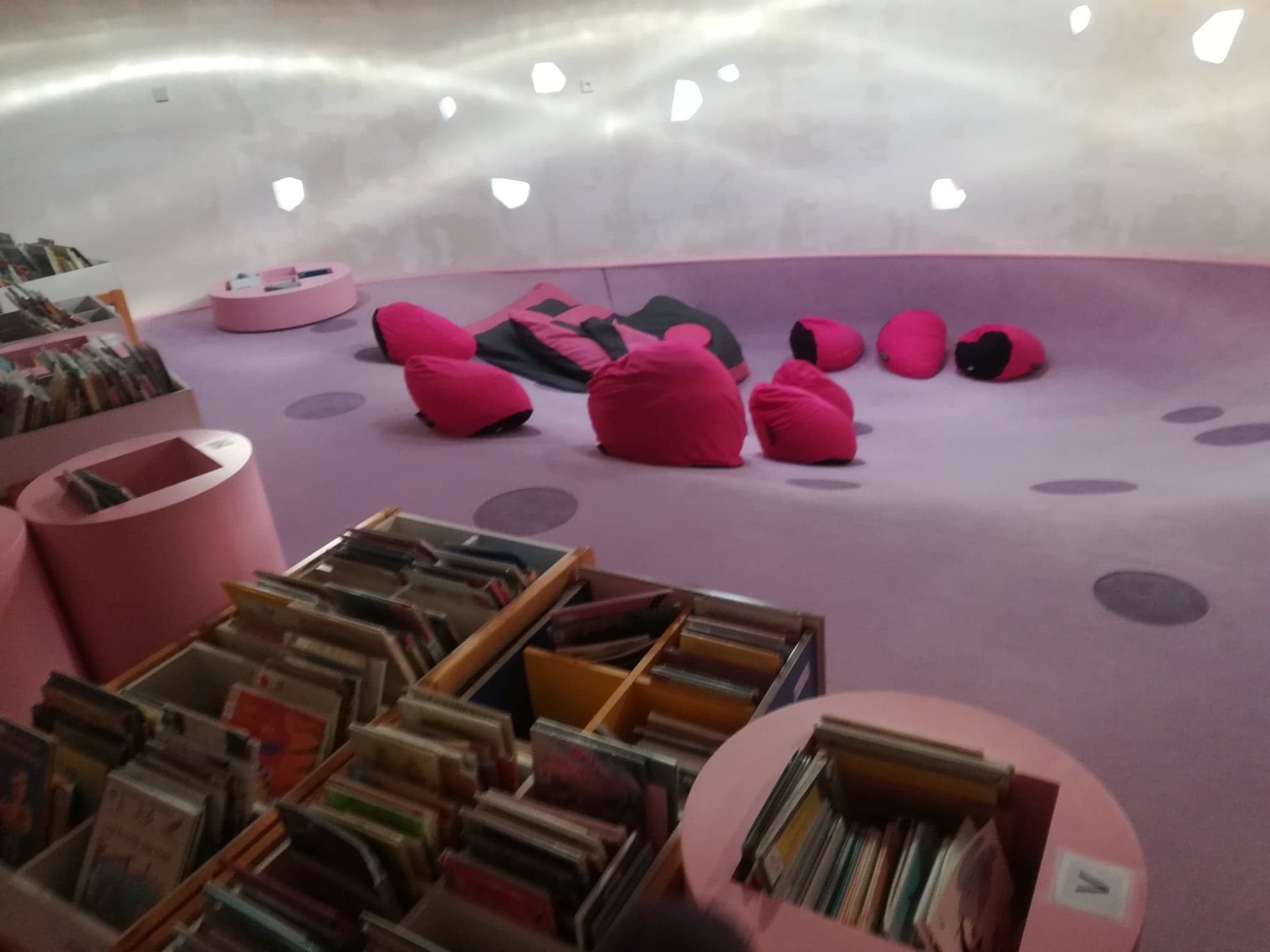 Ez a helyes rózsaszín űrállomás kérem az óvoda könyvtára. Csak az óvodáé, az iskolásoknak másik van a saját épületszárnyukban, azt is mutatom majd. Bár az iskolások mindig irigykednek erre a babzsákok meg a párnák végett, de az övékében meg kanapék vannak.