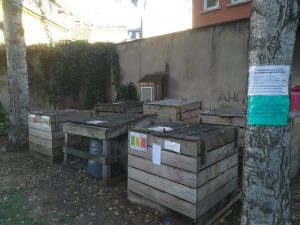 Igaz, ha az udvarunkban lenne a komposztáló, akkor már nem járnék ebbe a közösségibe ismerkedni, barátkozni… Hm, megfontolandó. Mert ugyanitt, a komposztáló ládák előterében van az a szabad könyvespolc, ami az előképen látható, arra az esetre, ha várakozni kellene, míg megjönnek a lakatkulccsal (mi a múlt szombaton így jártunk épp). Addig lehet olvasgatni (ha még nincs kivel beszélgetni, vagy épp nem tudok azon a nyelven, aki velem együtt üldögél a kis vödrével, ilyen is előfordulhat simán.) Vicces, mert a komposztálás után meg majd mindenkivel összefutunk a könyvtárban is. (Nagyon hasonló remek kezdeményezések vannak egyébként az Óbudai Platán Könyvtárban is, Budapesten!)