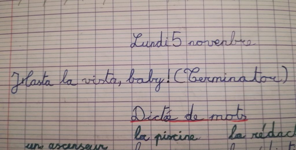 Nézegetem a gyerekek füzeteit, érdekes, itt élvezettel teszem ezt is, (na de még így sem csinálom gyakran…), mert Elizáéban mindig van valami idézet, szállóige, közmondás minden lecke előtt. Ilyenek, hogy “Veni, vidi, vici (Jules César)”, vagy “Cogito, ergo sum (Descartes)” vagy a “Minden út Rómába vezet”, vagy a “Jól csak a szívével lát az ember” vagy “egységben az erő”(l’union fait la force), “egy mindenkiért, mindenki egyért” (Les trois mousquetaires, Alexandre Dumas), és így tovább (még az is egy helyen, hogy “egyszer volt, hol nem volt… (mese)”. Hirtelen megakad a szemem ezen: