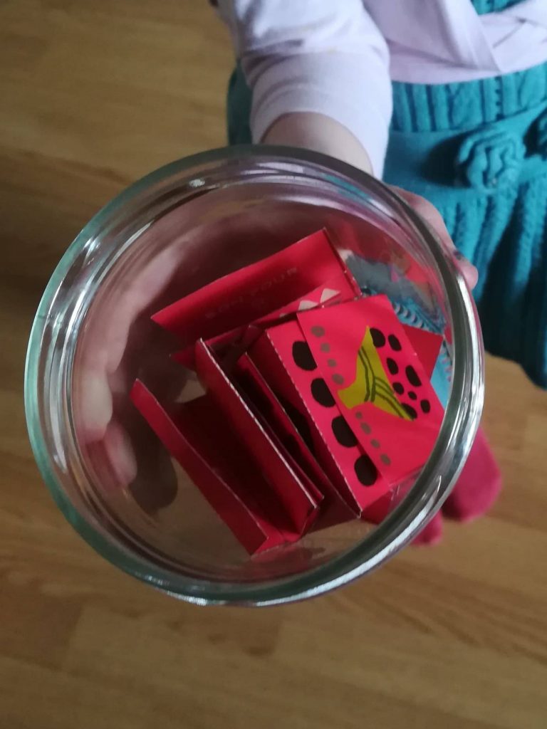 Hozzávalók: olló, üres lekváros üveg, ragasztó vagy cellux (a címke, és a tetődísz felragasztásához, sajnos az enyémek ezt a többi hulladékkal együtt kidobták, és még nem rajzoltunk egy sajátot, személyeset, azért ilyen dísztelen a mi üvegünk), színes ceruzák vagy filctollkészlet.